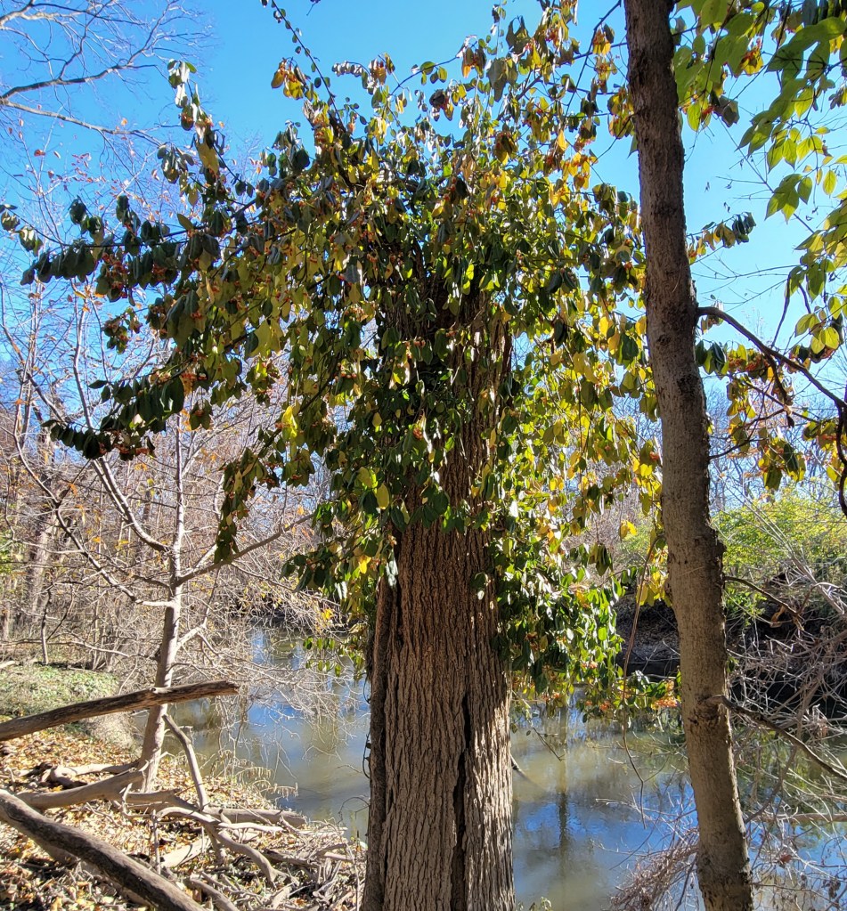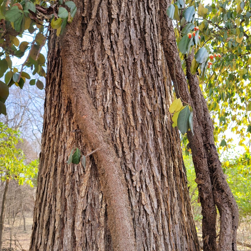 Winter Creeper vines grow straight up large trunks, using small aerial roots to grasp and hold onto the bark.