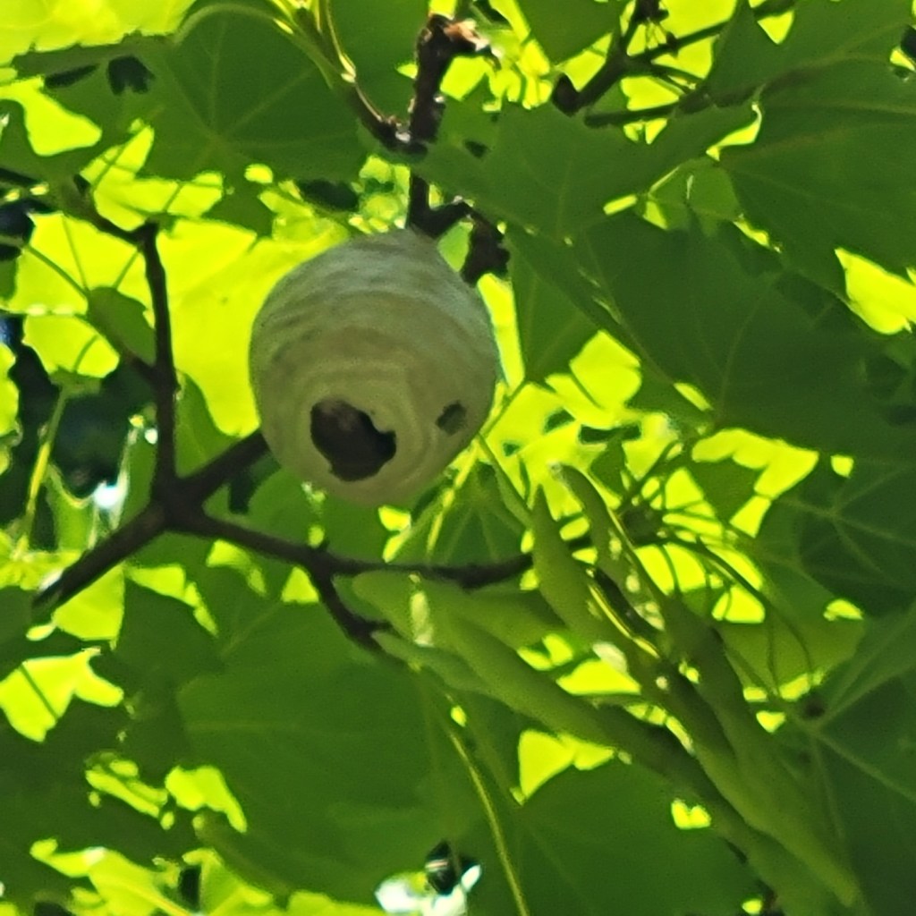 This nest, found on June 6, was probably the first stage, the initial construction. It was about three inches long. Since I had never seen an early-stage nest before, I watched until a hornet emerged so I could confirm the species.