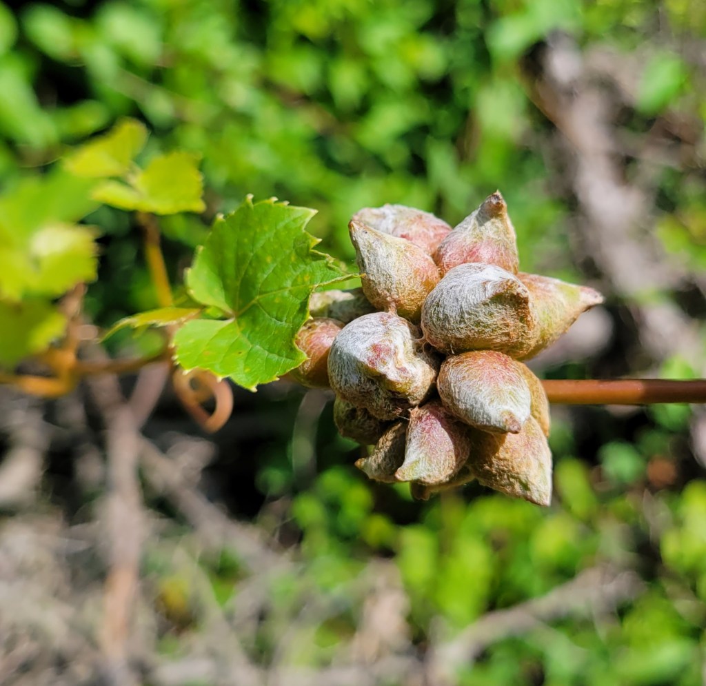 A fascinating gall is occasionally seen on wild grape vines. It resembles a bunch of filberts or hazelnuts and each is a midge “nest.”