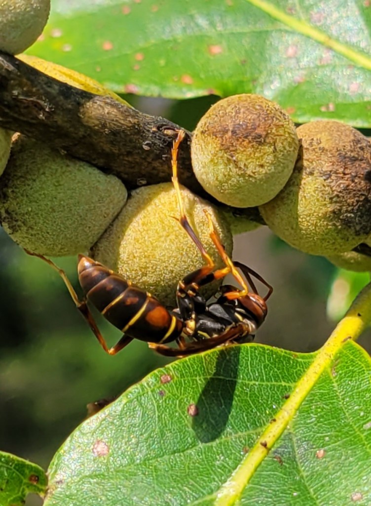 These wasps are able to stimulate the oak to ooze sweet sap, attracting other insects to patrol the galls and prevent attack by predators.