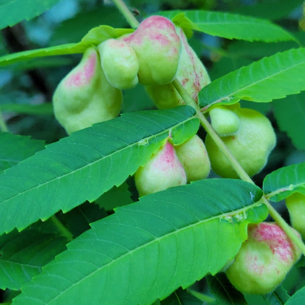 This gall is the most recent find. It is on some Staghorn Sumac shrubs. Inside the galls are developing aphids.
