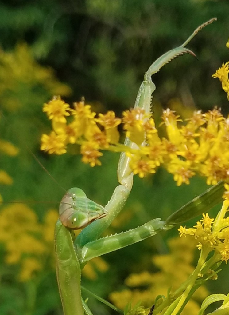 6. Later this month, a variety of goldenrods will be in bloom, attracting many insects. One of them, Praying Mantis, patiently preys upon others.