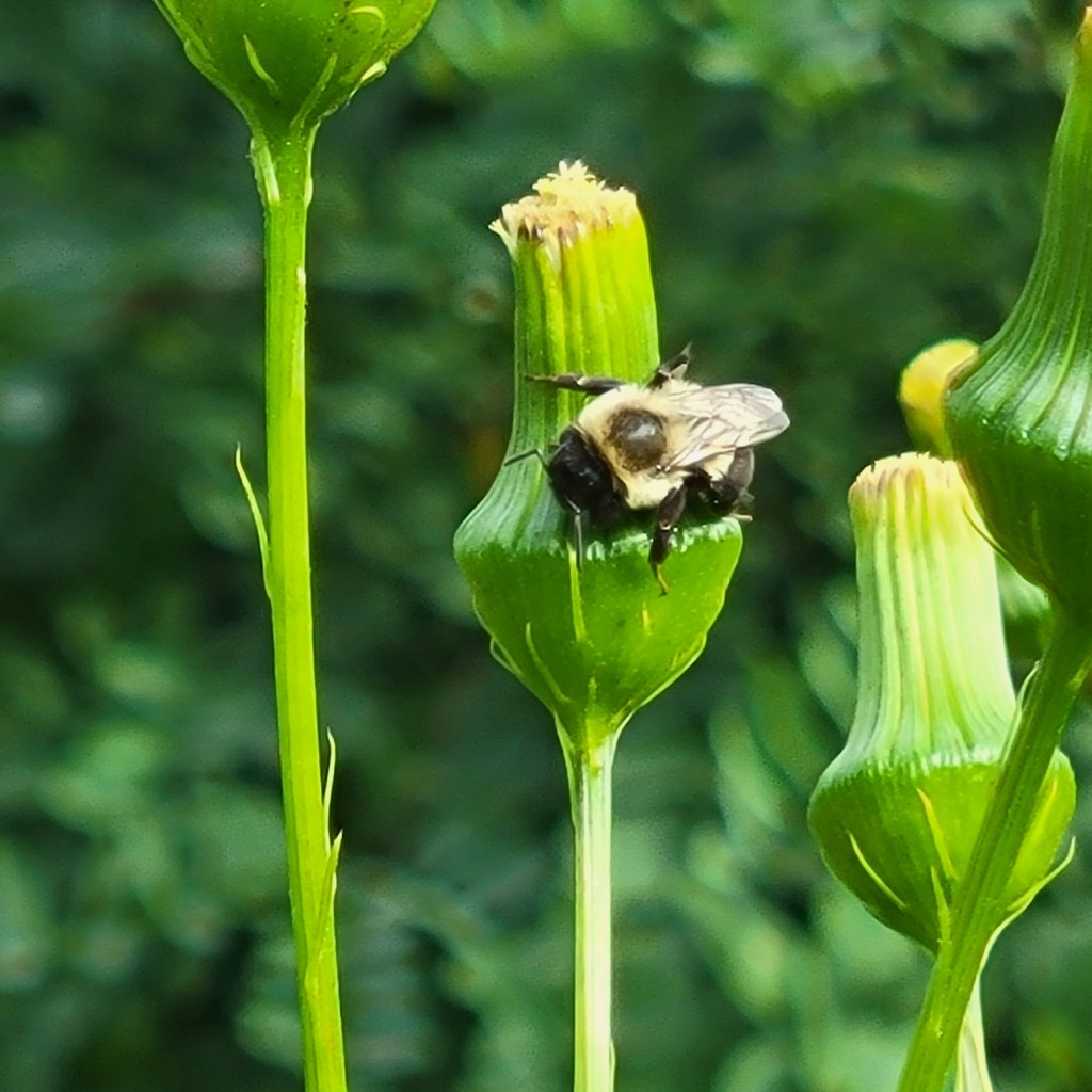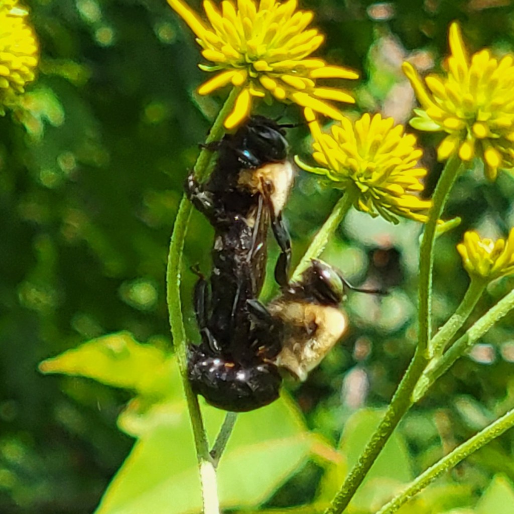 Recently I came across a pair of bumblebees mating (on Wingstem flowers). This was a rare opportunity to observe a male bumblebee, which can be seen to be considerably smaller than the female-to-be-queen.