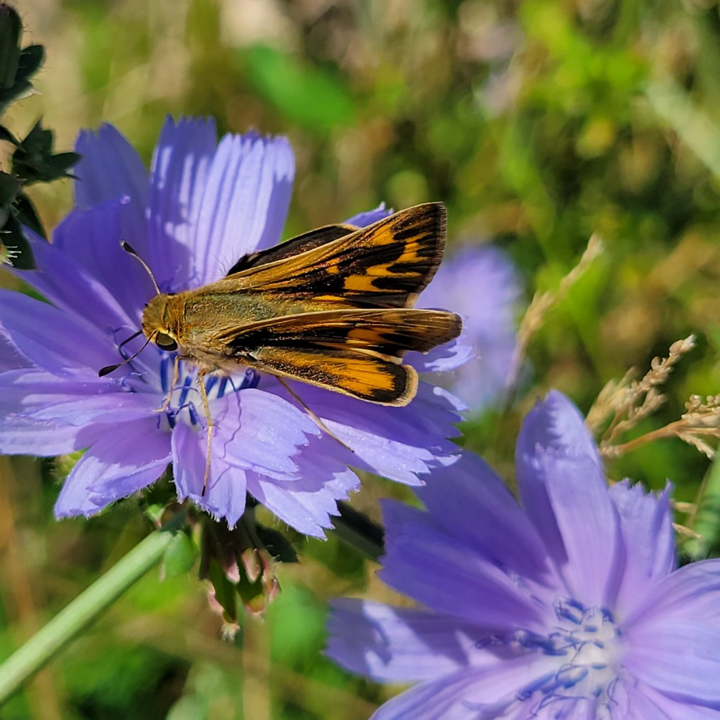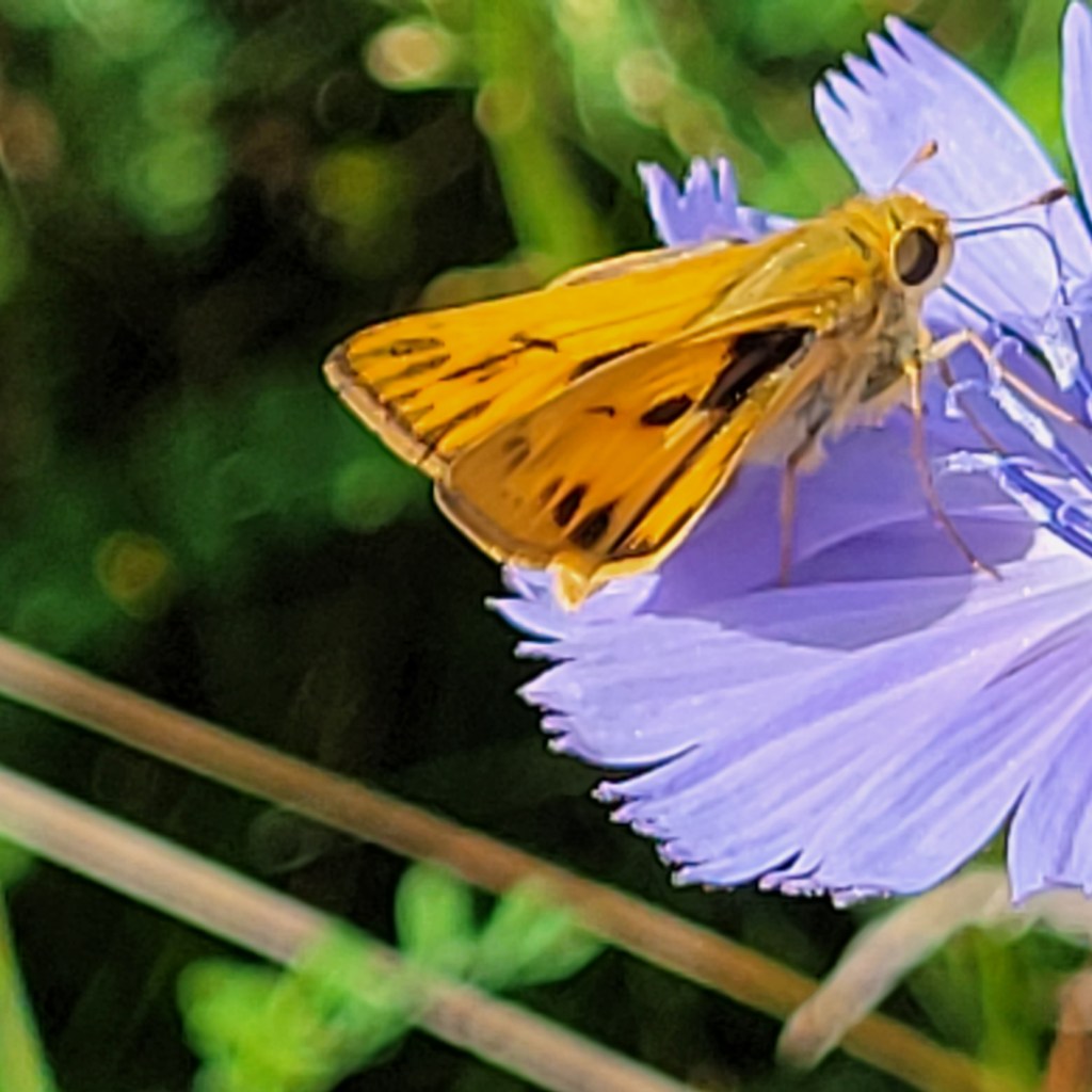 This week I spotted the 35th butterfly species of 2022 in Eliza Howell Park, a little orange and brown/black skipper that I did not recognize immediately. It was nectaring on Chicory.