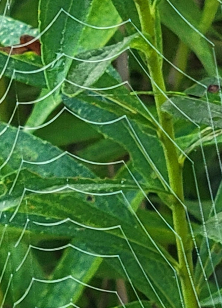 Many times I just admire the webs, which the spiders reconstruct every night. When the web is wet, the design is visible and fascinating. It is (nearly) invisible when dry, not seen by the insects that fly into it.