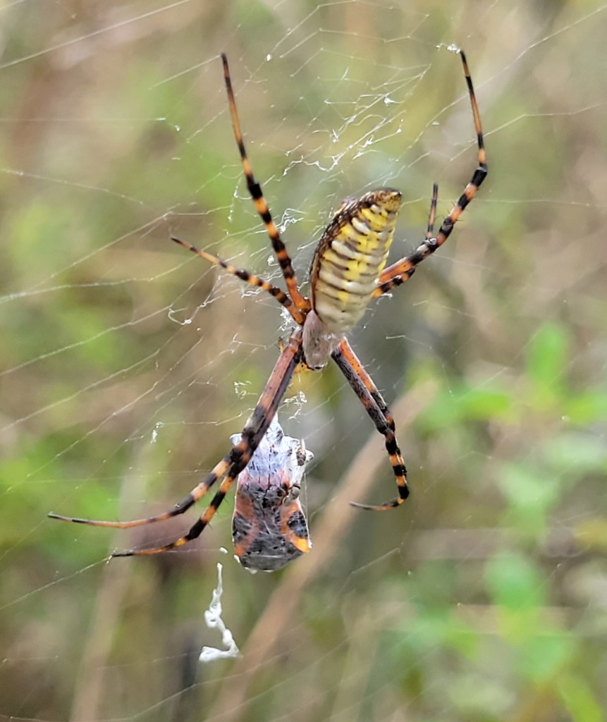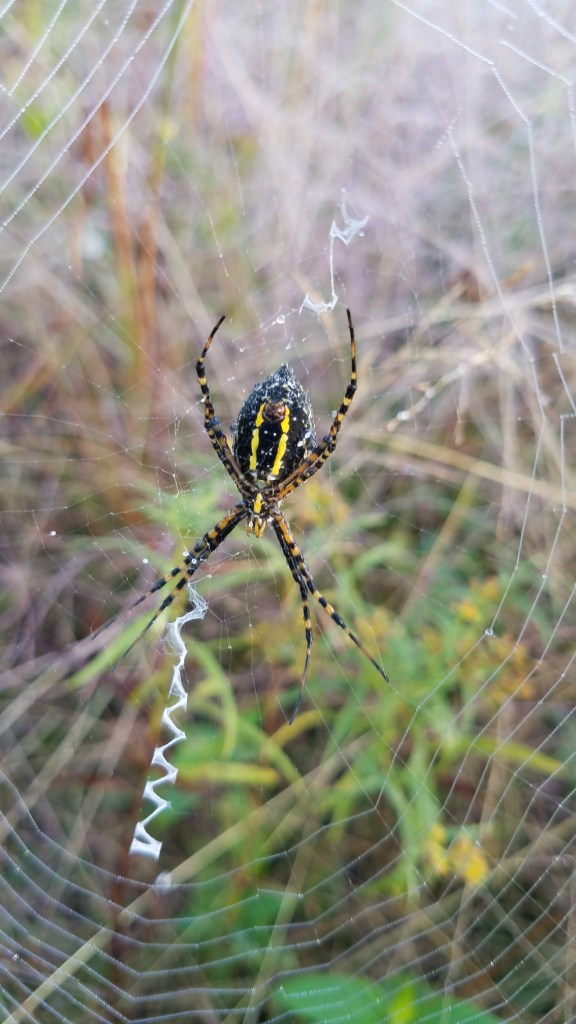 One report claimed that Banded Argiope orient their webs on an East – West axis. I have only observed a couple of their webs since reading that report and these two webs did fit the described pattern. I will need to see more, however, before I feel confident determining directions from these webs on a cloudy day in an unfamiliar location. If correct, this would add to the fascinating behavior of a favorite September spider.