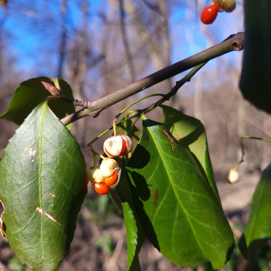 The river path can be walked both upstream and downstream from the footbridge. Near the end of the path downstream, there are some climbing vines with evergreen leaves and late-ripening berries (Winter Creeper Euonymus), easily missed in the summer but very visible in November.