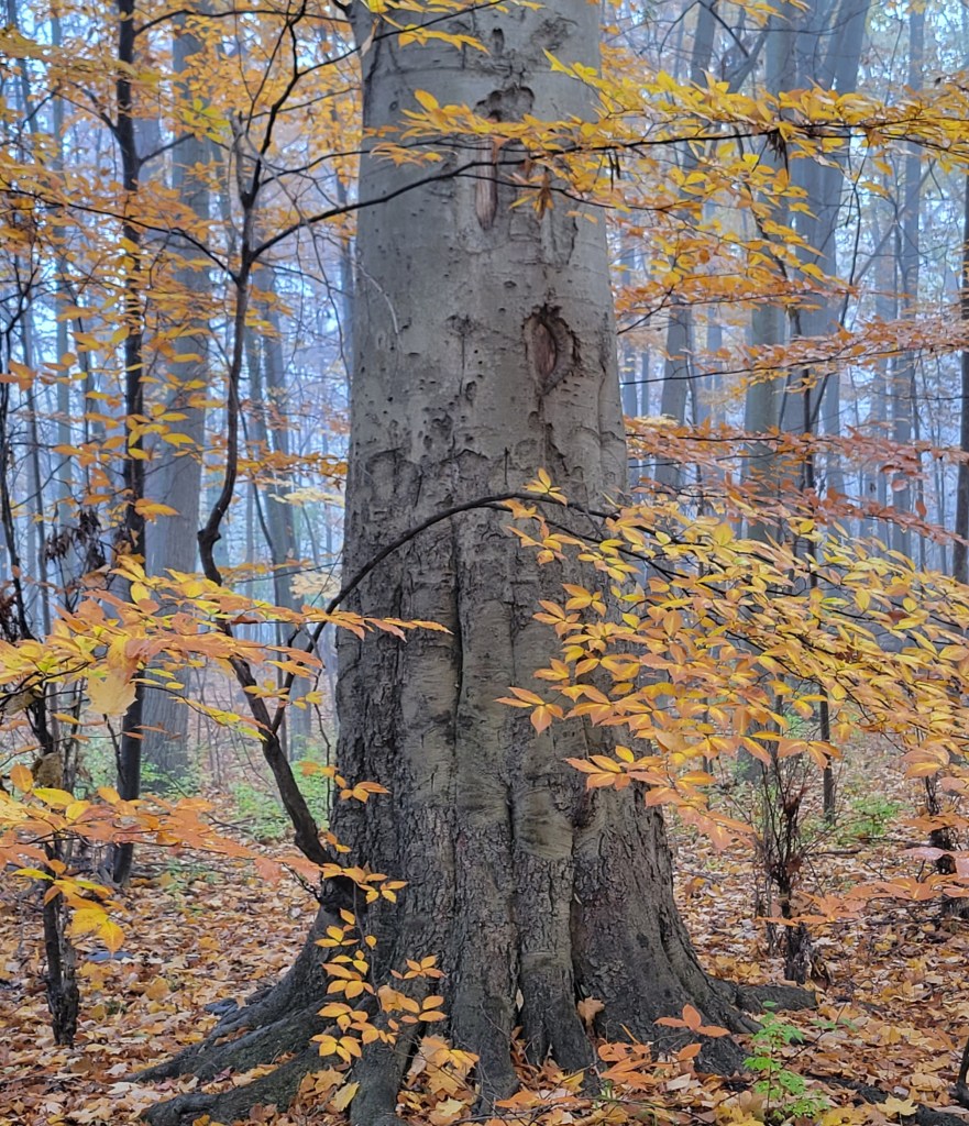 Tree trunks stand out at this time of the year, calling attention to the great variation of species and of size. The next photo is of a large American Beech. The young beeches at its base gradually lose their leaves in November.