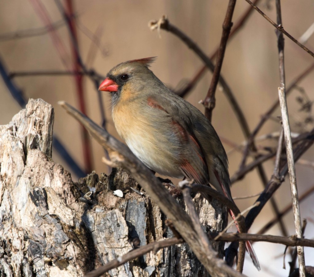 One of the January regulars is the Northern Cardinal (a female is shown here). Cardinals are among the twenty plus species that are found year-round in the park, usually recorded every month of every year.