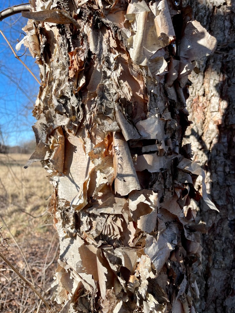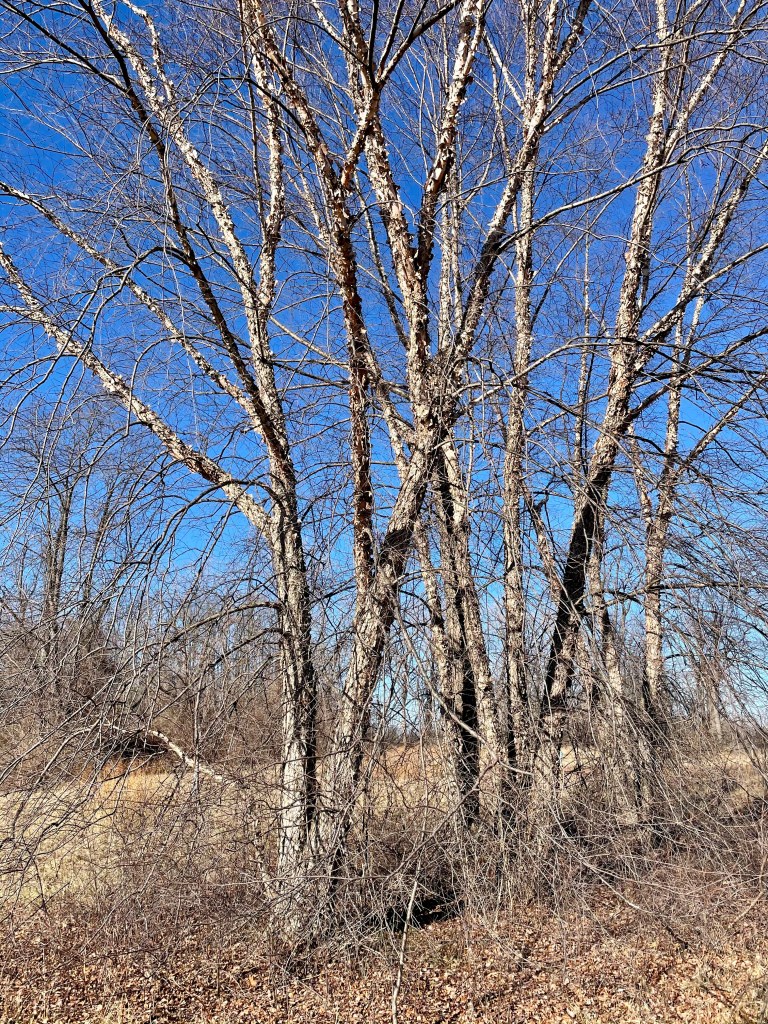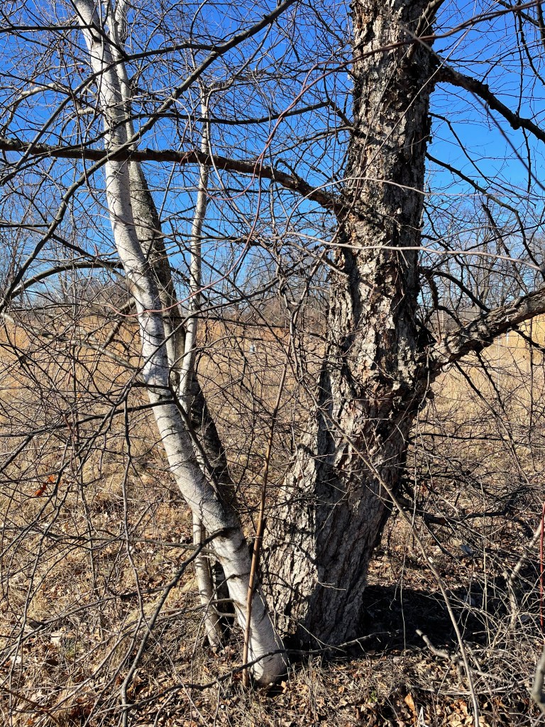 At one spot at Eliza Howell Park, rather than a three, five, or seven group of either gray or river birch, there is just one gray and one river birch.