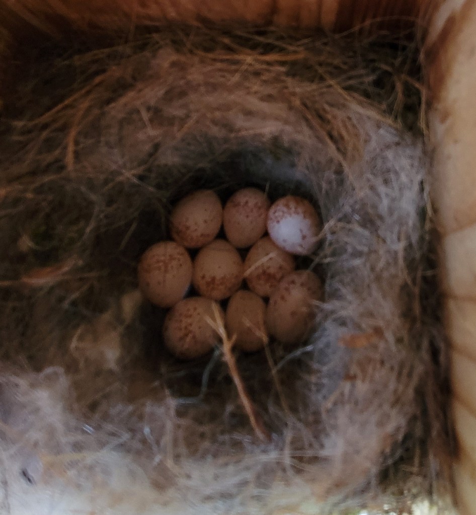 On the morning of May 2, after seeing both of the birds fly away, I quickly walked to the box to take a look. The nest was packed with 9 small eggs.