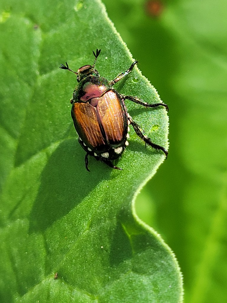 One commonly seen shiny beetle in southeast Michigan is the Japanese Beetle, and, on first glance, someone might think “Japanese Beetle” when seeing Dogbane Beetle for the first time. A comparison makes the differences clear.