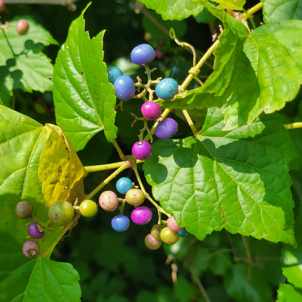 The multicolored berries are numerous and popular with several bird species. Birds eat many of the nine berries pictured here, but Porcelain Berry is the most popular berry food in mid-September.