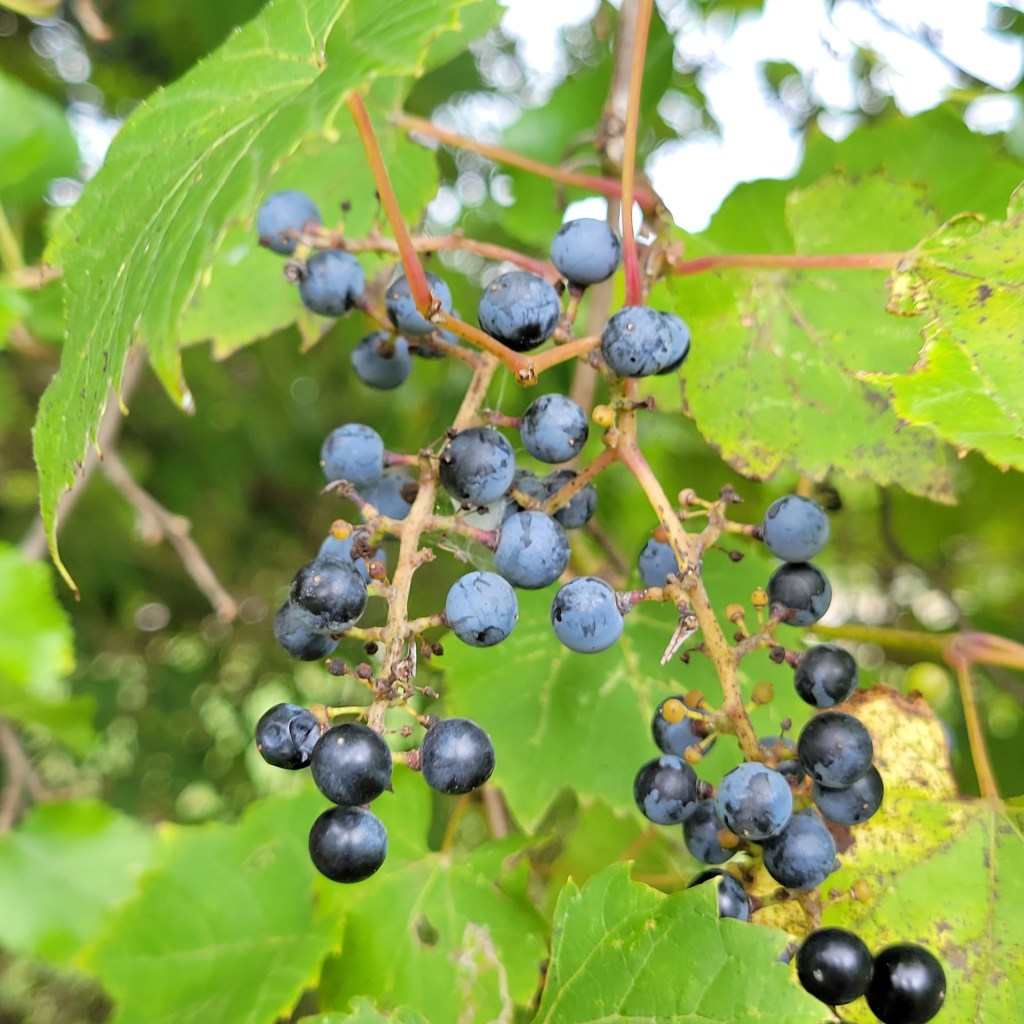 Virginia Creeper is one of my favorites. I love the look of red stems holding ripe blue berries (here, not quite fully blue). It ripens earlier than many, usually well along in the middle of September when I first start my vine rounds.