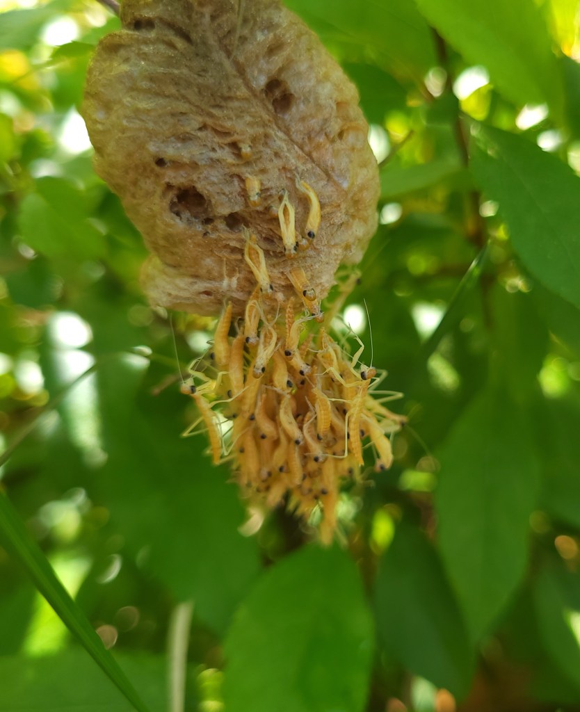 Many insects go from egg to larva (or caterpillar) as part of their development. Some wasps, including the Blackberry Knot Gall Wasp, lay eggs on plants which they “persuade” (chemically) to grow galls to protect the insects as they develop inside.