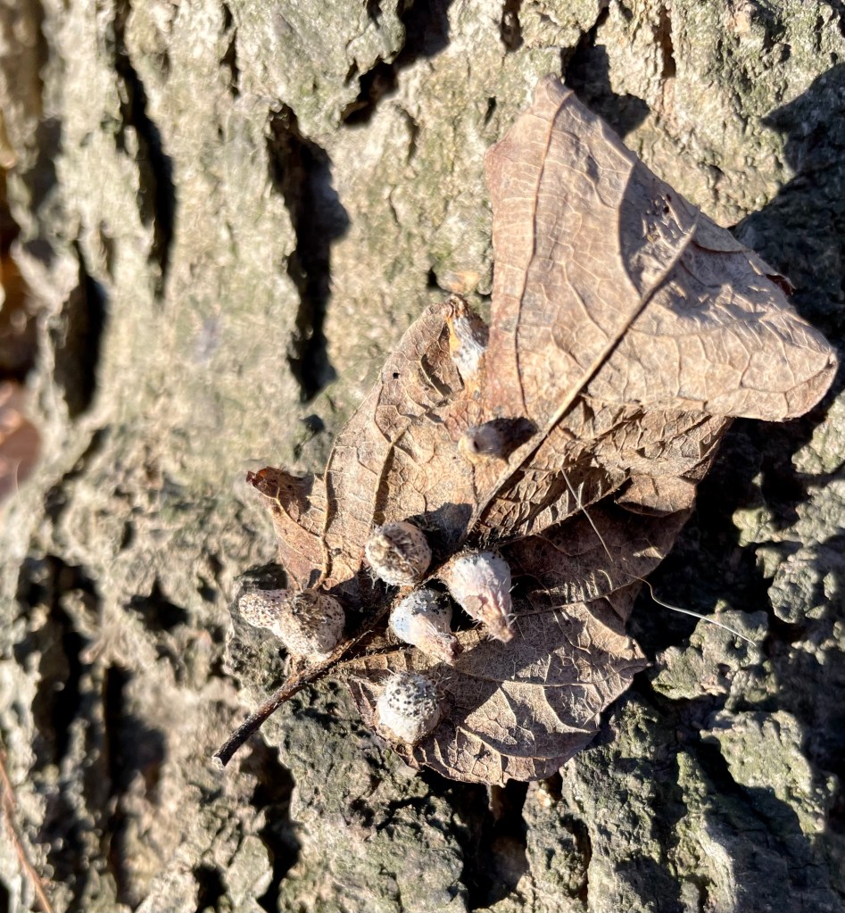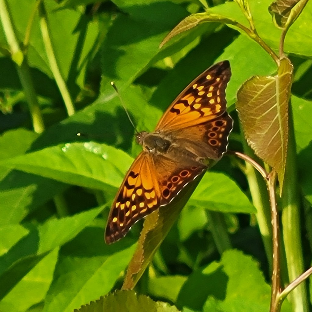Butterflies are not often associated with trees, but there are several species of butterflies seen at Eliza Howell that rely on hackberry trees for incubation and food: Hackberry Emperor, Tawny Emperor, Mourning Cloak, and American Snout. The Tawny Emperor butterfly, for instance, lays its eggs in clusters on hackberry leaves in late July. The emerging caterpillars eat through the leaves and then scatter, each looking for a leaf to overwinter and then, in early summer, emerge as butterflies. Neither the psyllids nor the butterflies damage hackberry trees.