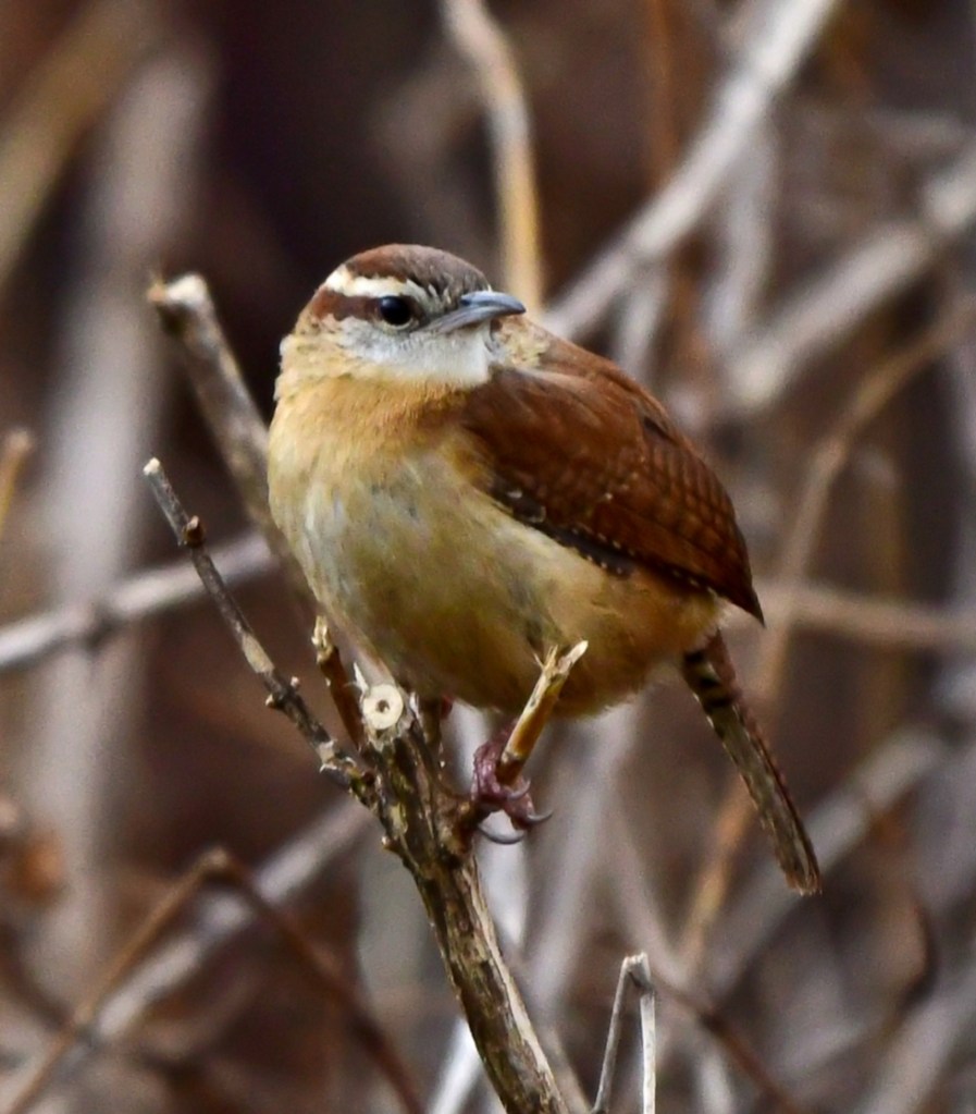 Carolina Wren is another bird that is frequently seen (or at least heard) in winter in the park. They have the same mates year after year. And they are together all year, not just in breeding season; when I see one/hear one now in January, I usually see/hear two.
