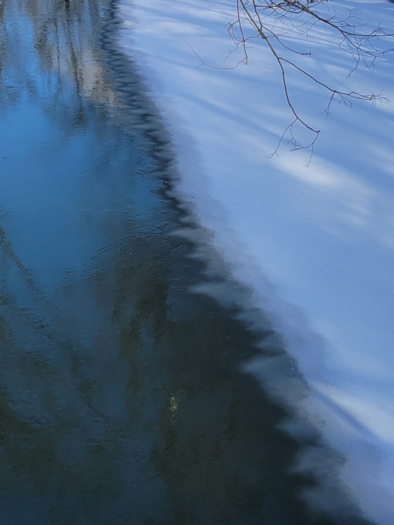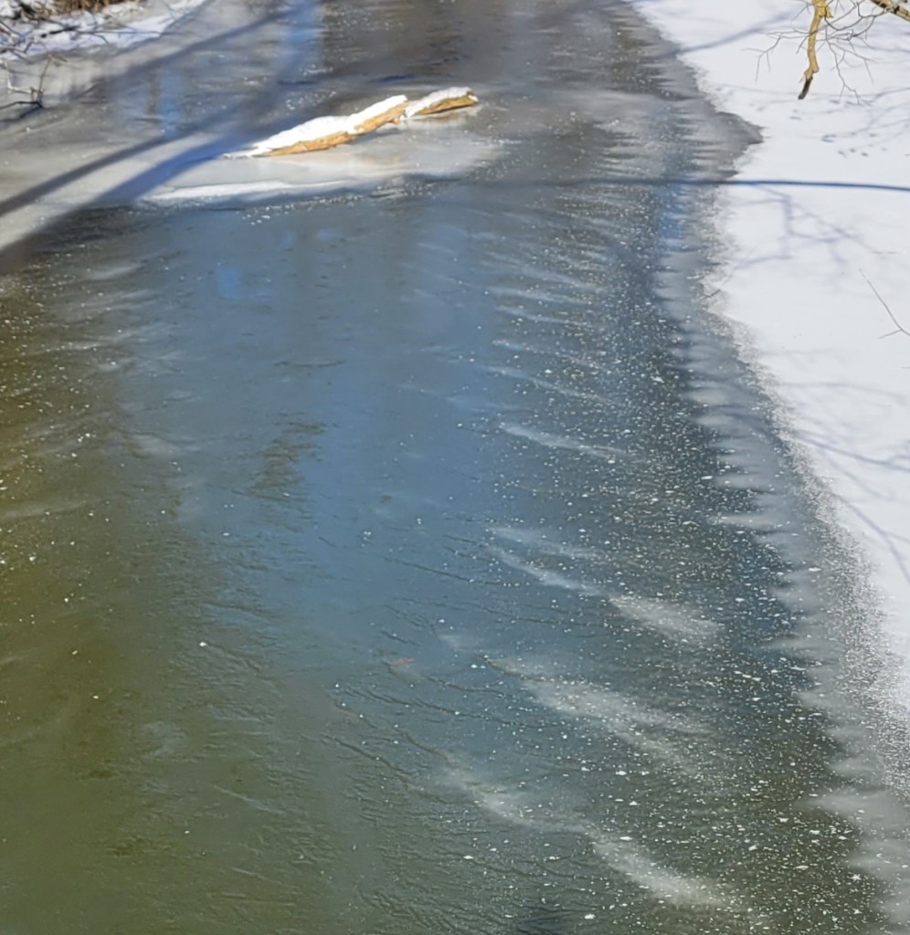 There was no additional snow, so the ice in the center of the river is not easy to see. A closer view confirms that the ice now stretches from shore to shore.