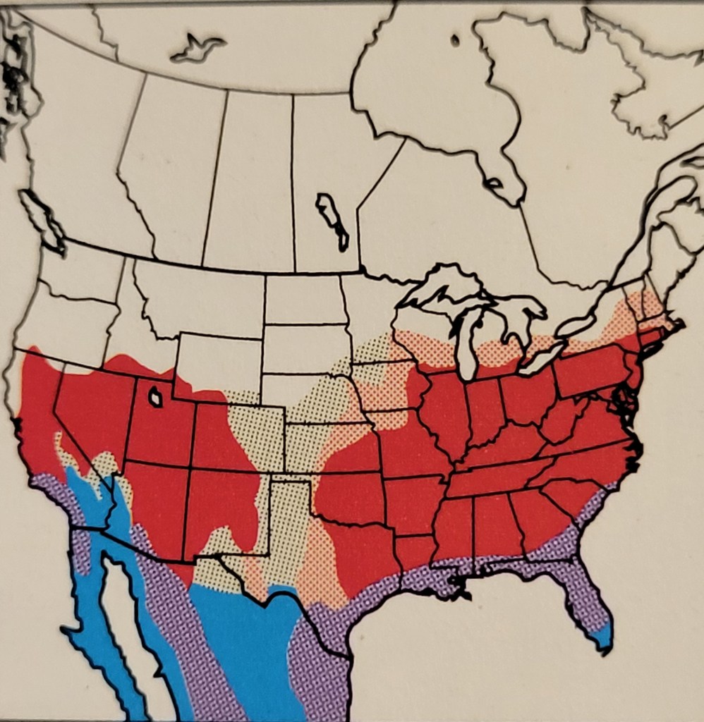 Though Blue-gray Gnatcatchers are regular breeding-season residents of Eliza Howell Park, they are not abundant overall and are not recognized by many people. They have been expanding northward in recent decades, but they remain much more a southern species. Southern Michigan is as far north as they breed. (Map key: red = breeding season; blue = winter grounds; purple = present all seasons.)