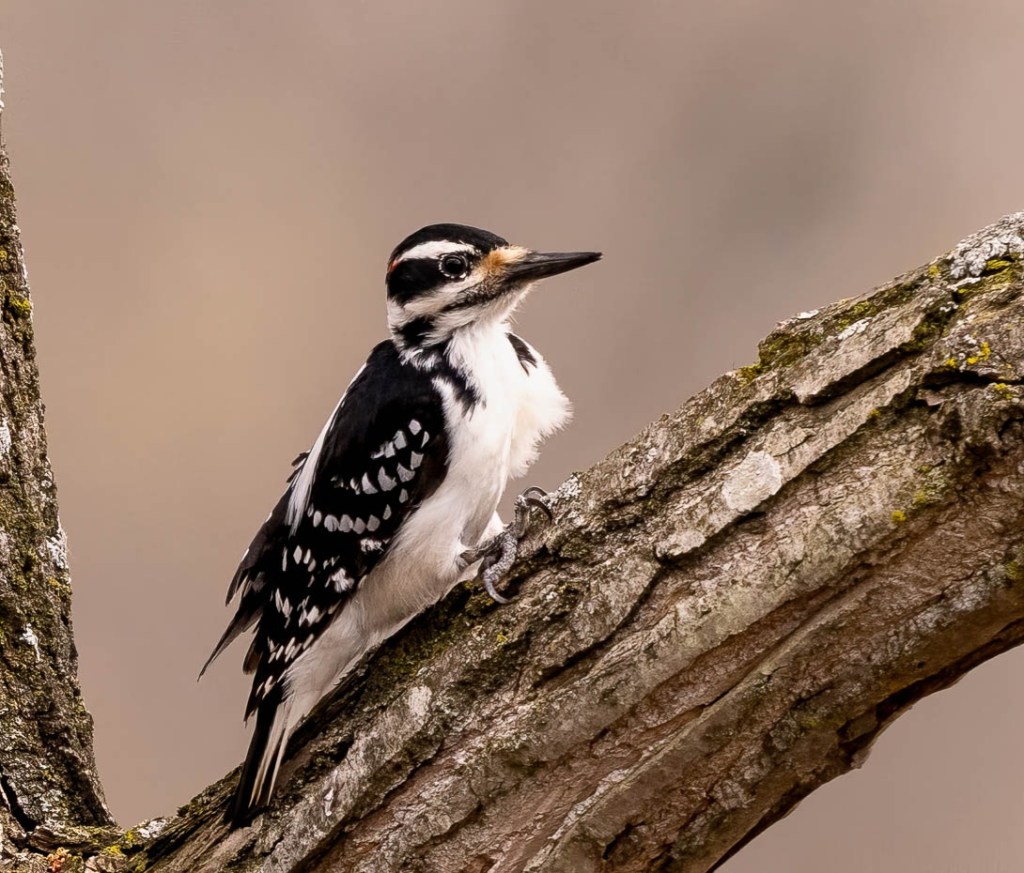 Downy Woodpeckers often excavate their nesting holes on the underside of a slanting dead limb.