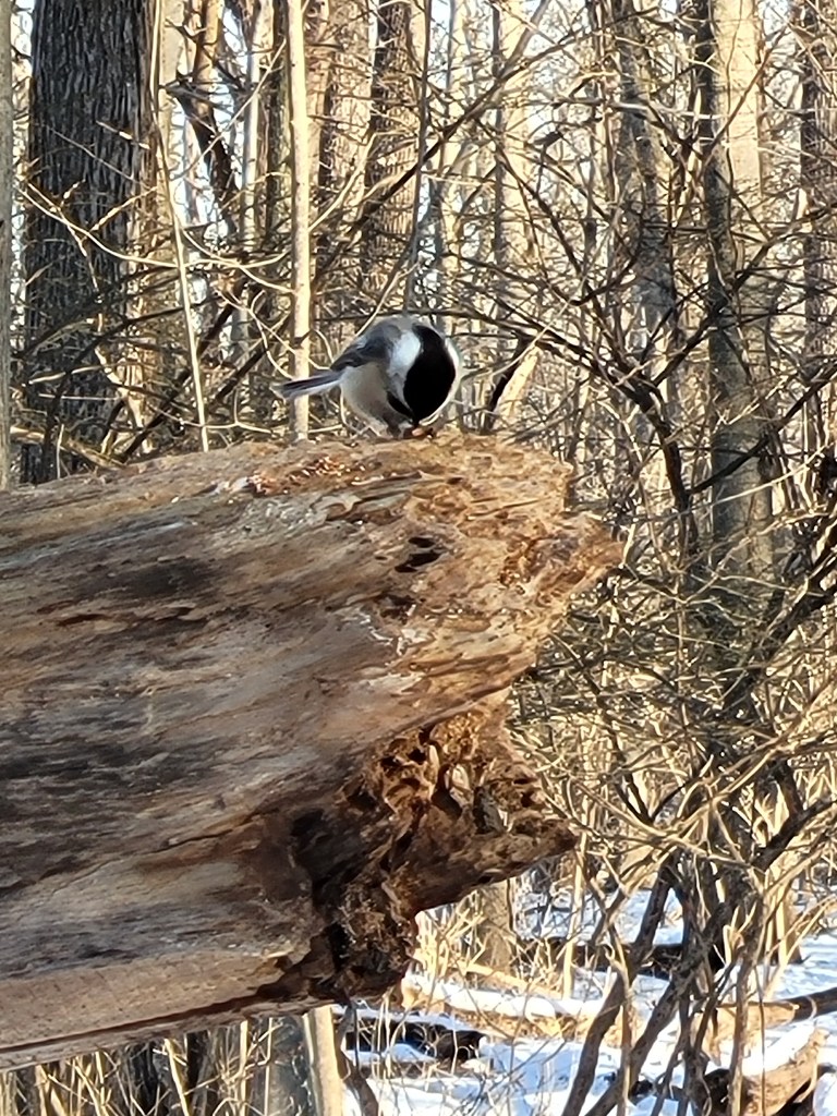 I recently spotted a Black-capped Chickadee on a raised log by the walking path.
