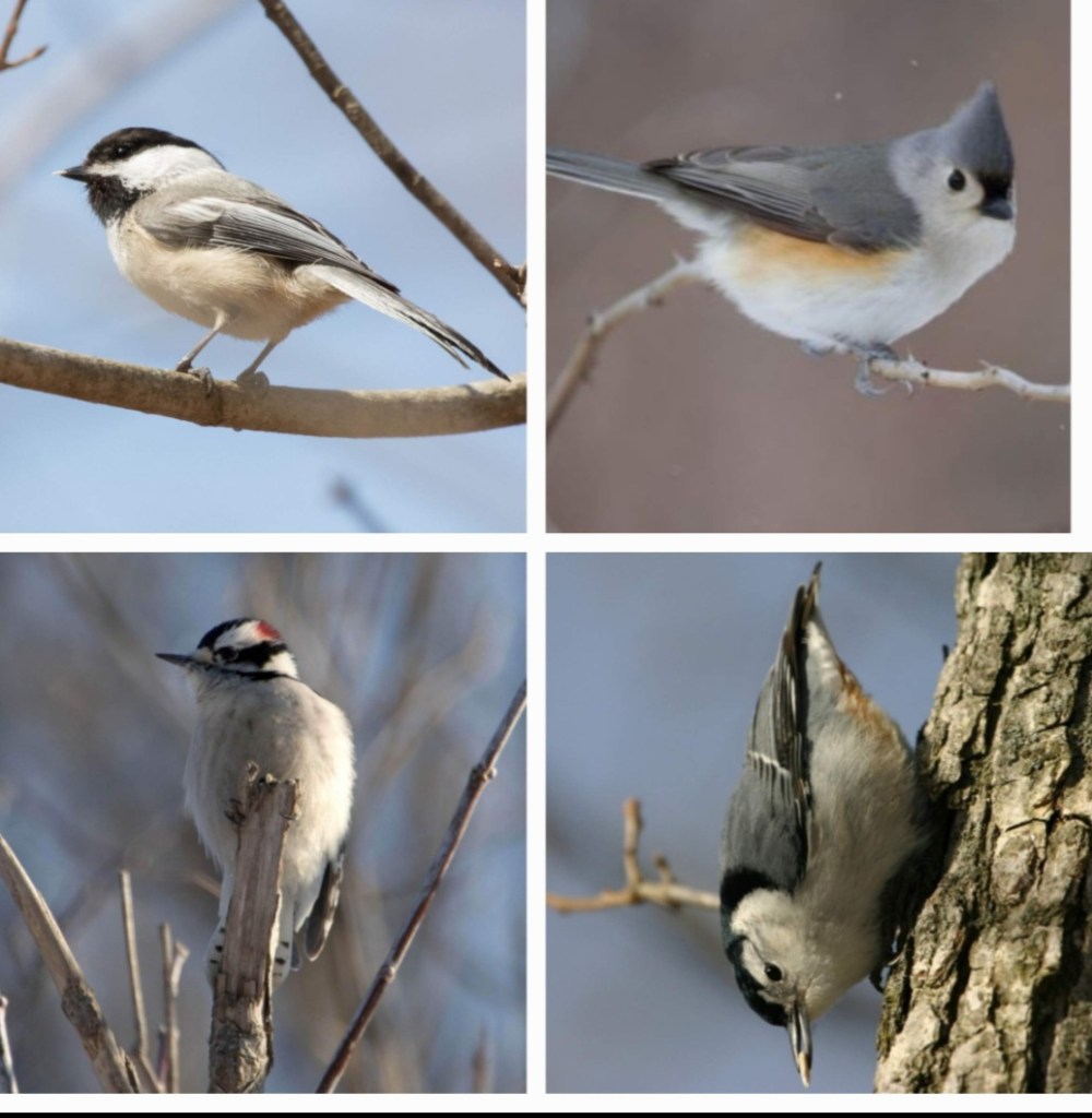 Black-capped Chickadees are often seen in winter in a small mixed-species flock. In addition to the three companions shown in the collage below, the flock of small birds might include Brown Creeper or Golden-crowned Kinglet.