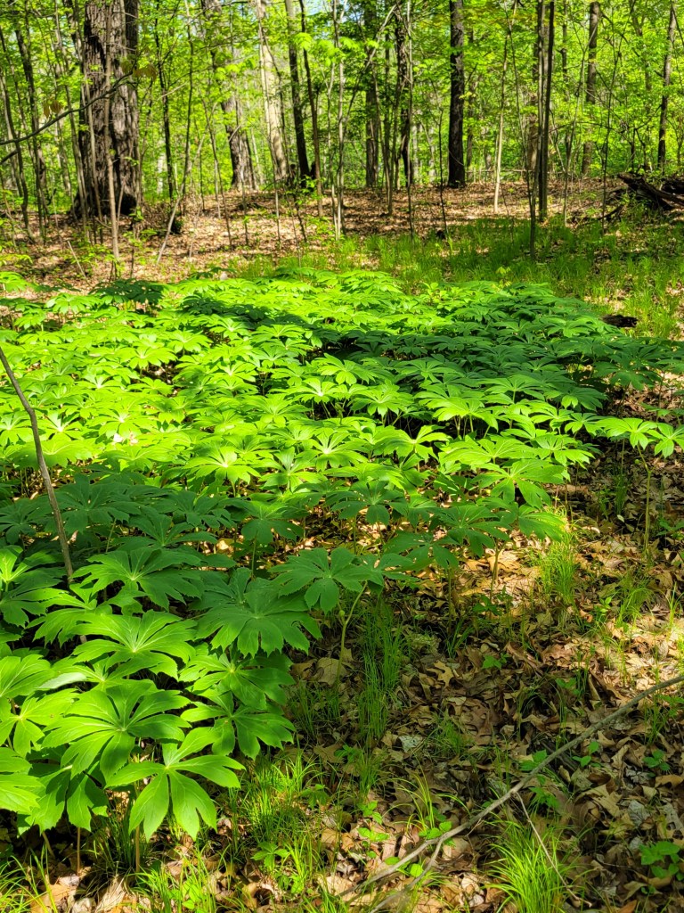 Long before I learned about their medicinal qualities, however, I greatly enjoyed coming upon a Mayapple patch. It is a fascinating colony flower, and this is the season it is in bloom. It is a highlight of the forest floor in May!