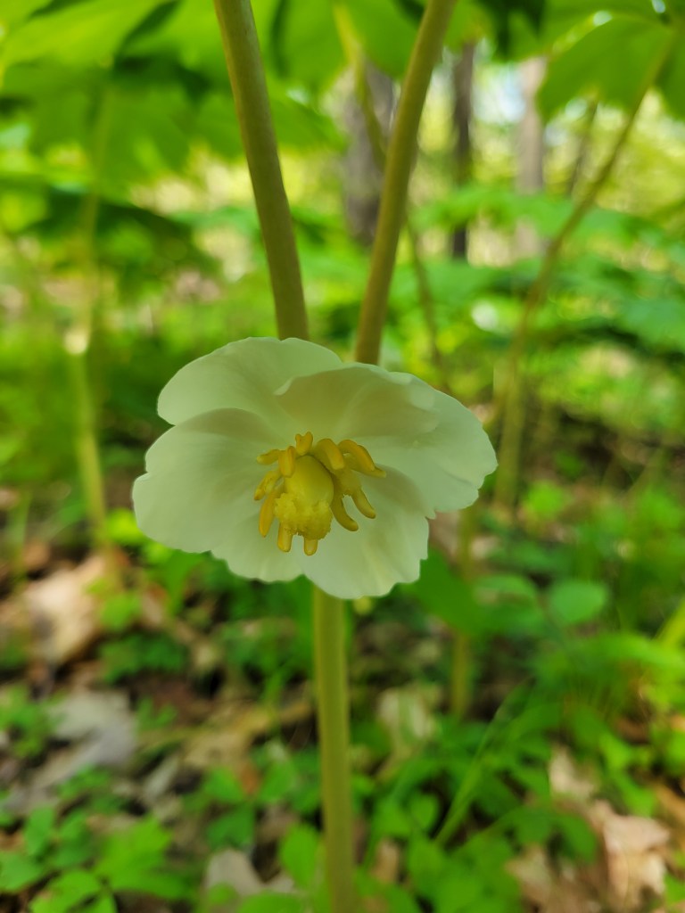 Mayapple is flowering now, and the apple-like fruit matures in the summer. The fruit is green at first, ripening to yellow.