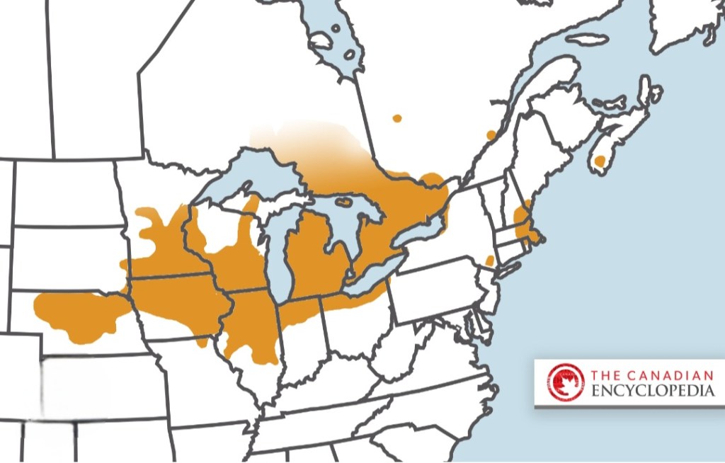 Blanding’s Turtle is not a common species, found almost only in the Great Lakes area. The following map is from The Canadian Encyclopedia.